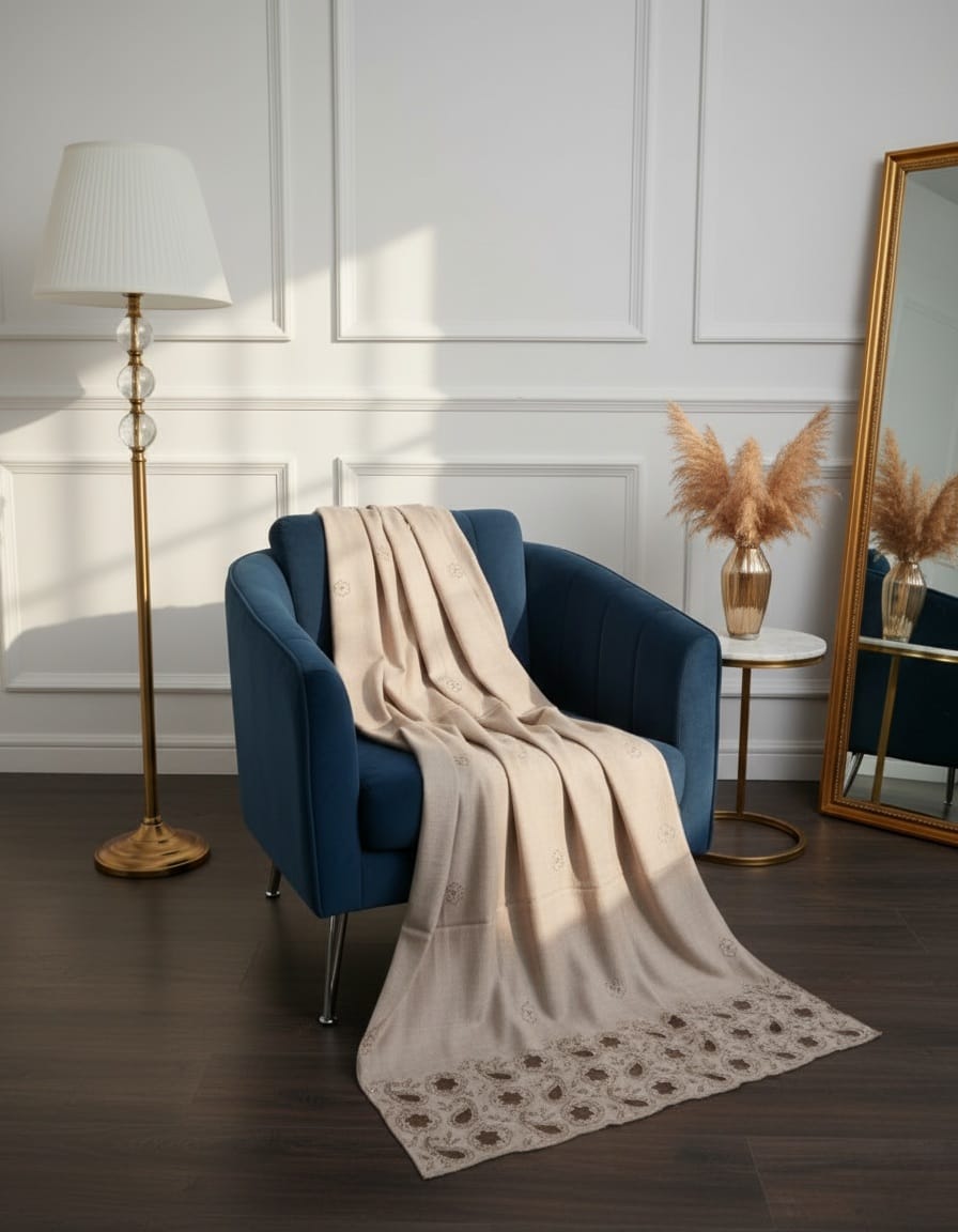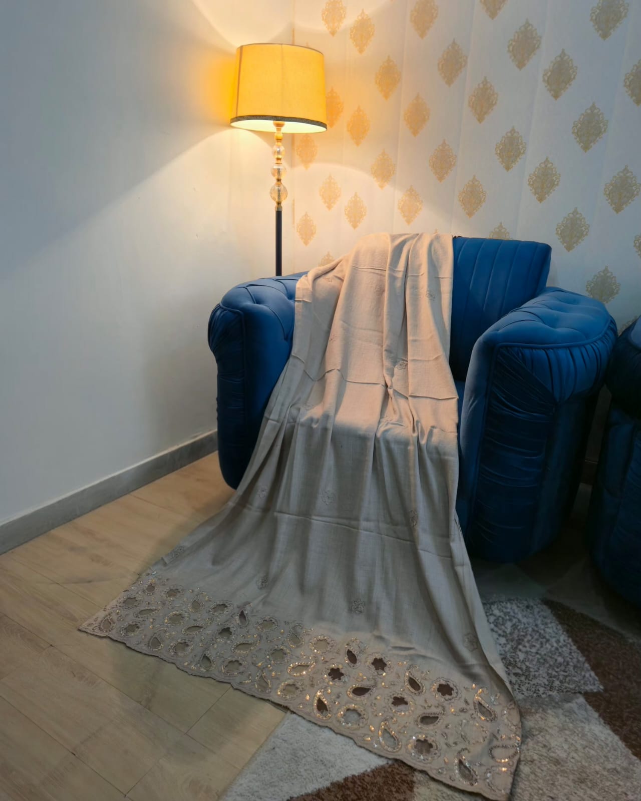 Explore the beauty of Kashmiri artistry. Unmatched warmth and compassion are provided by this stunning pashmina shawl. Because of its intricate, multicoloured embroidery, which produces a striking contrast, it is the perfect standout piece for any formal event. An authentic investment in traditional fashion.
