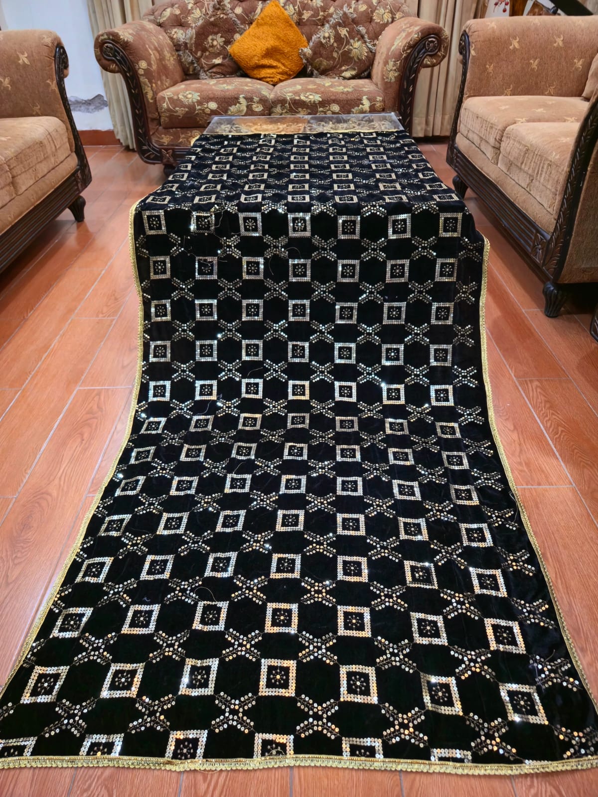 This luxurious Velvet Shawl is warm and elegant. It features sparkling Sitara (sequin) work on the corners and borders. It drapes beautifully and adds a classy touch to any festive outfit. Available in many differnt shades.